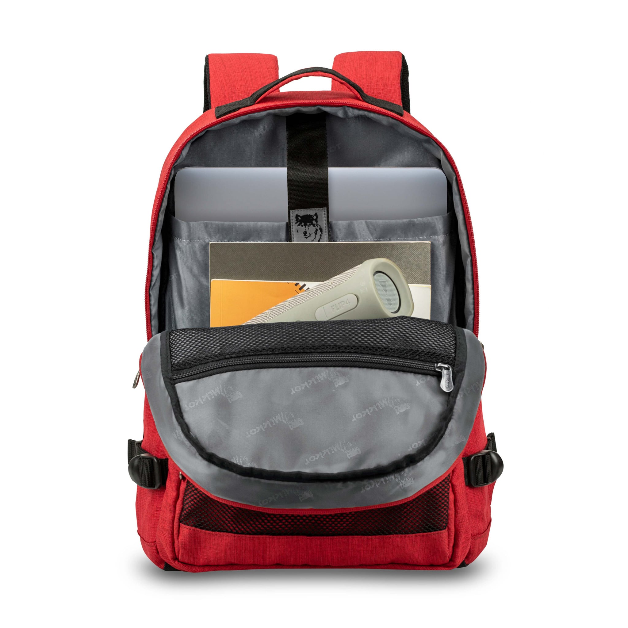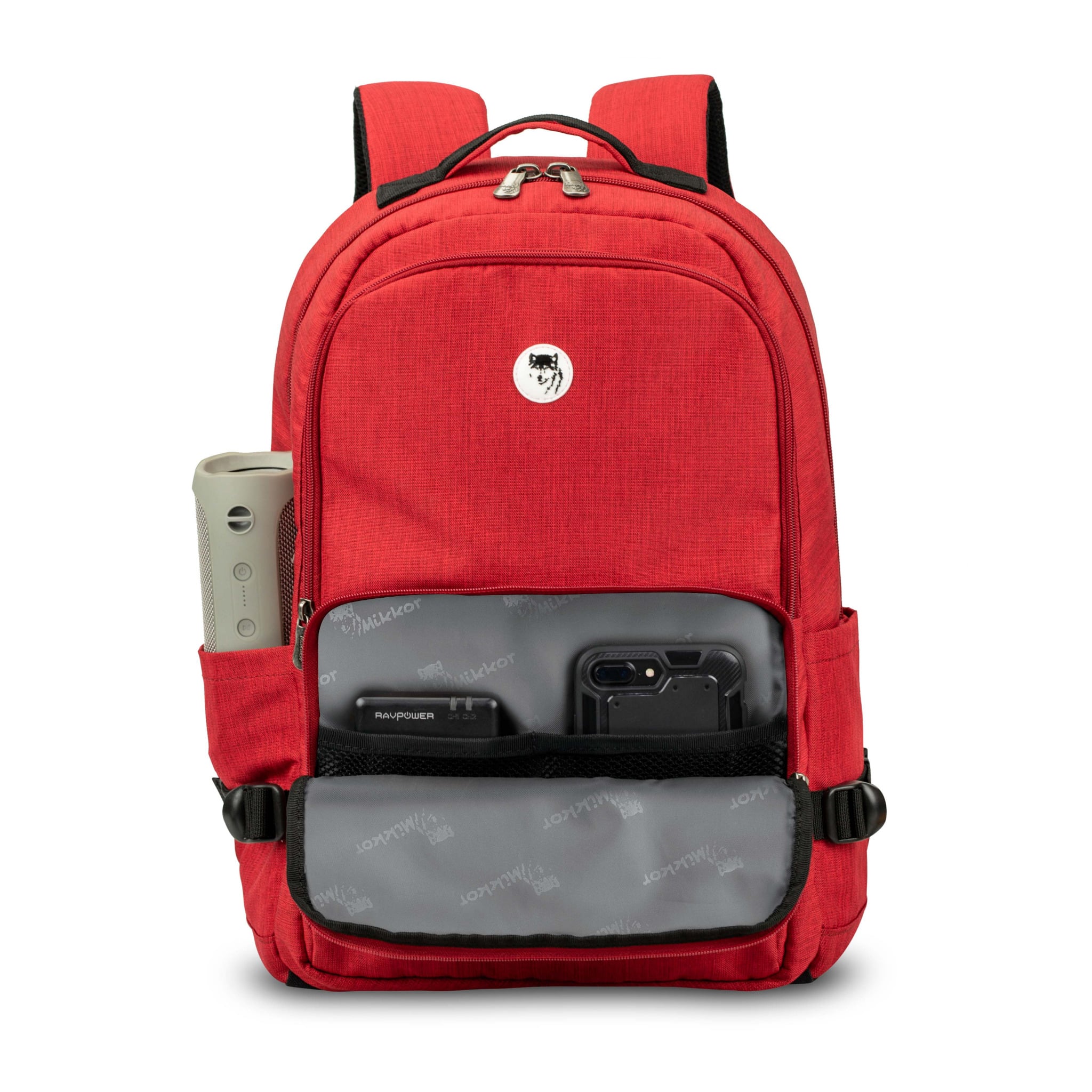 Mặt trước balo đính logo chú sói biểu tượng thương hiệu MIKKOR nổi bật.