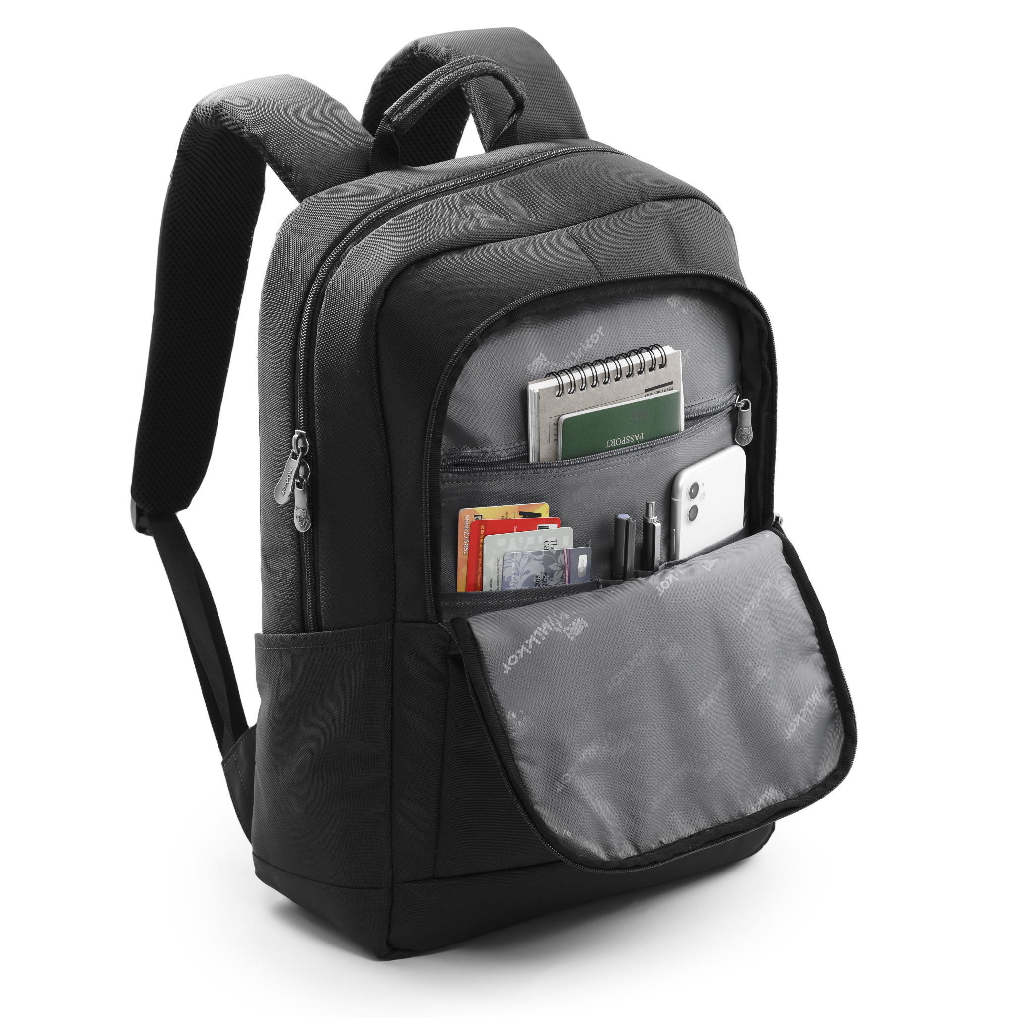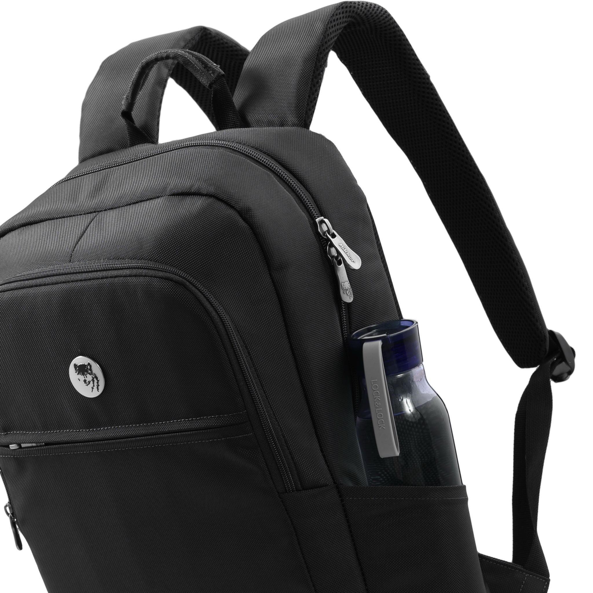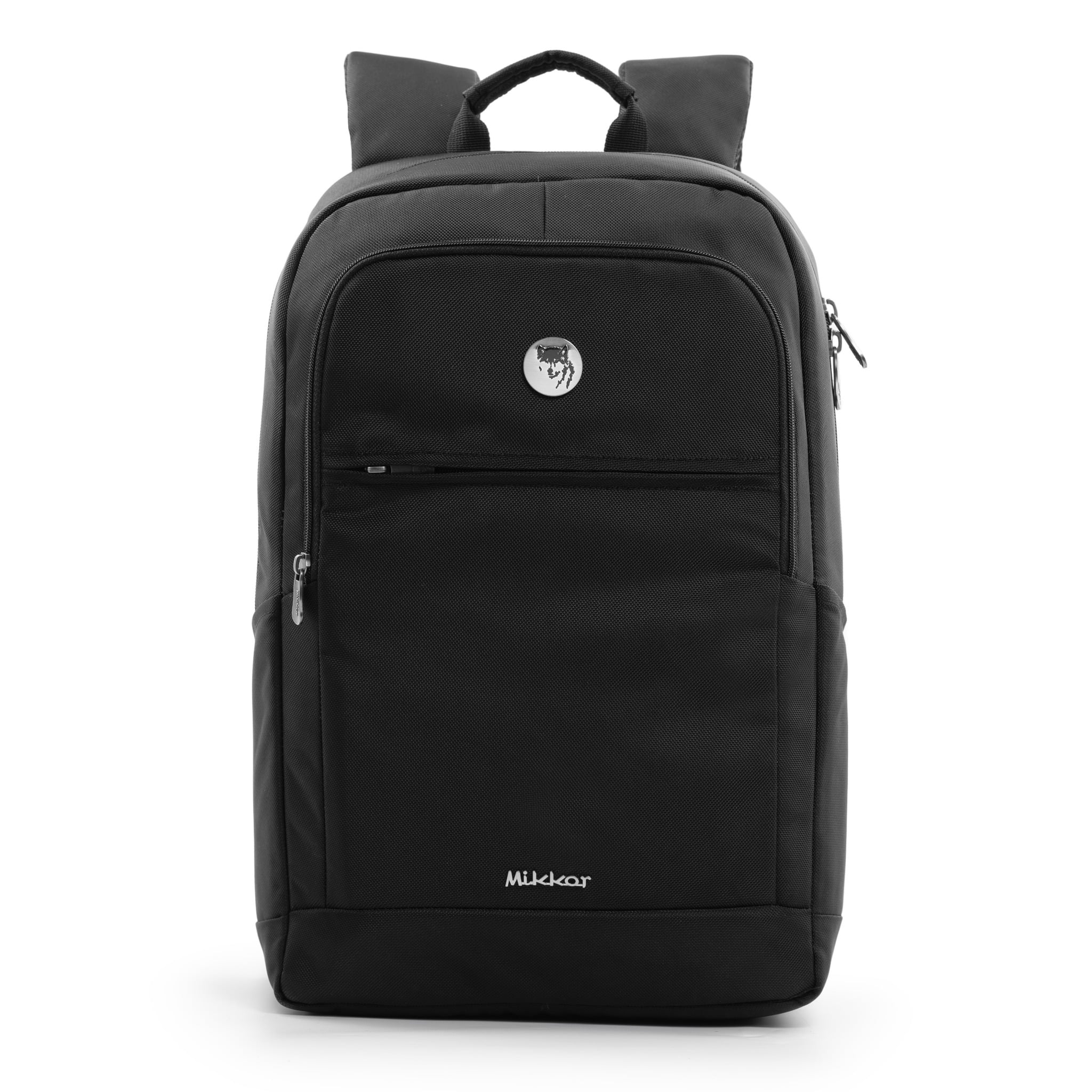 Mặt trước balo đính logo chú sói biểu tượng thương hiệu và logo hợp kim MIKKOR nổi bật.