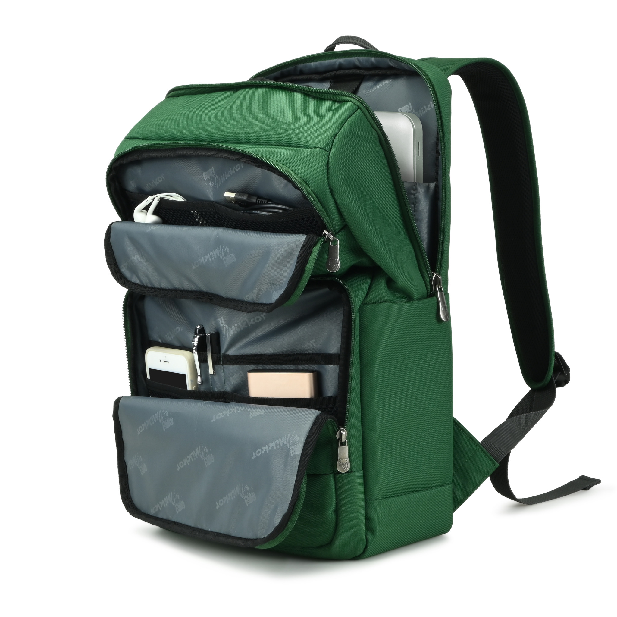Quai xách và quai đeo êm, có thể tăng giảm. Logo chính đính trên mặt trước sản phẩm. Logo thương hiệu Mikkor bằng hợp kim đính dưới mặt trước thân túi.