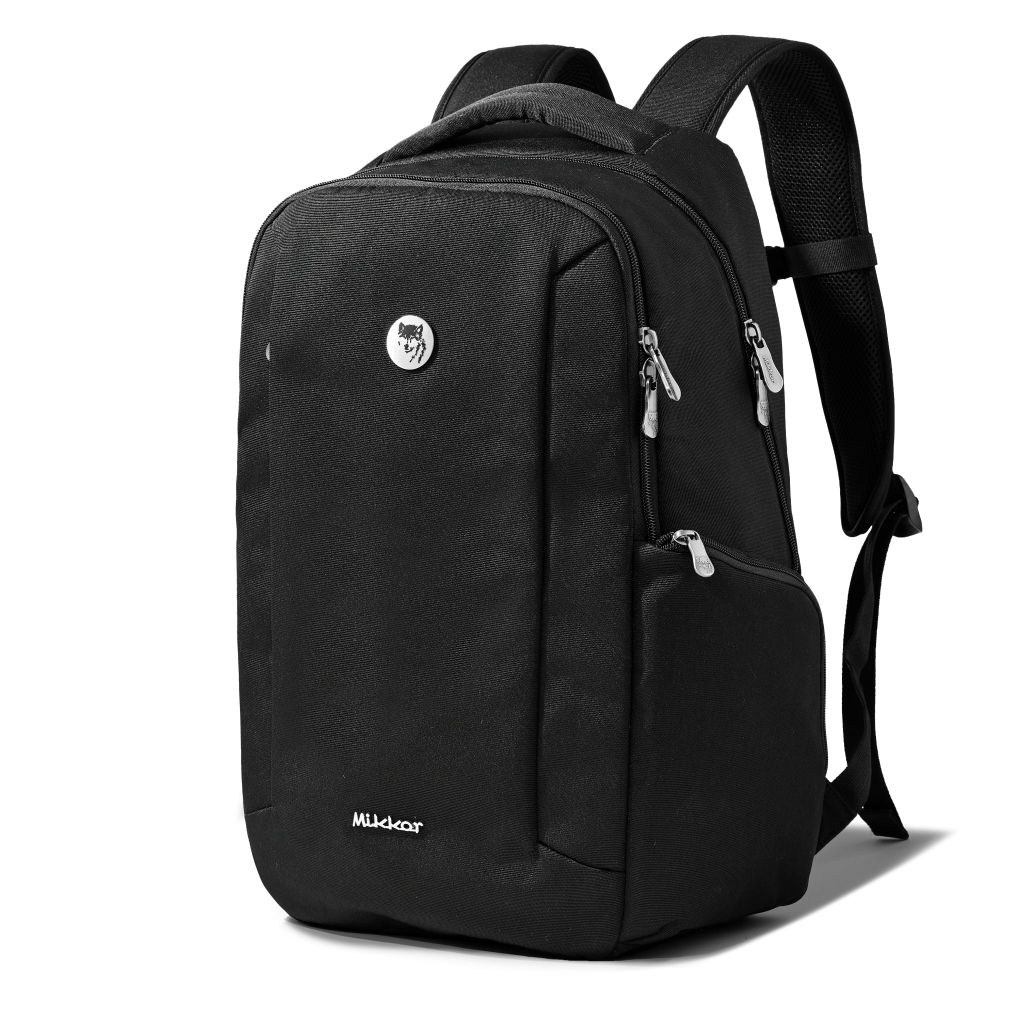 Mặt trước balo đính logo chú sói biểu tượng thương hiệu và logo hợp kim MIKKOR nổi bật.