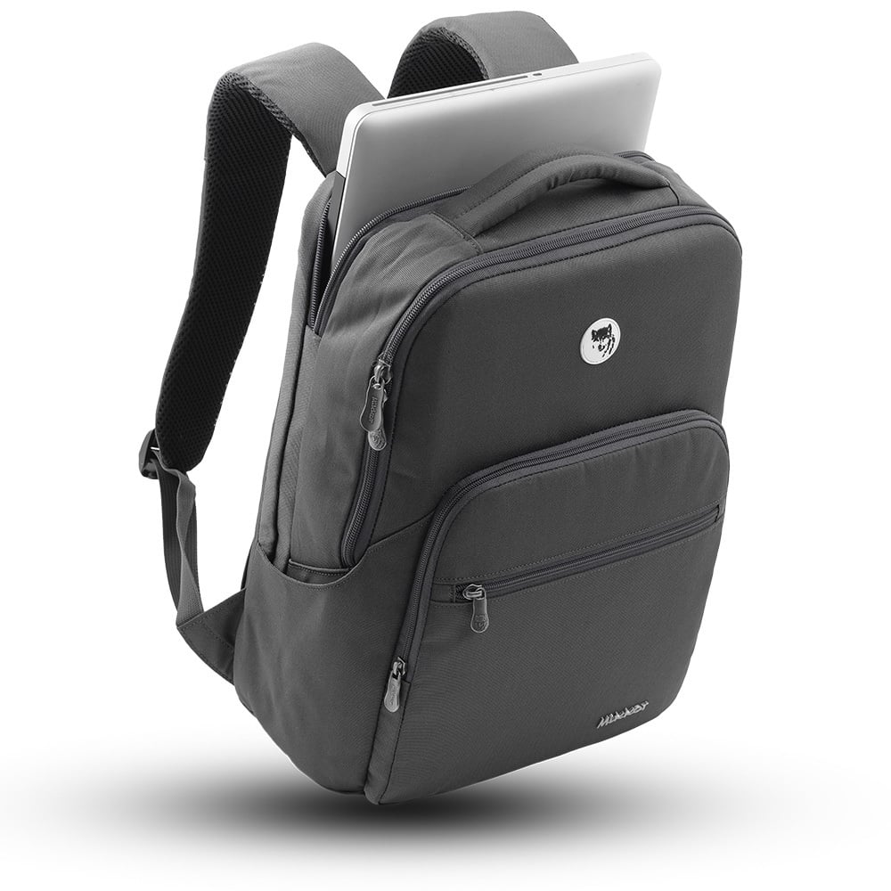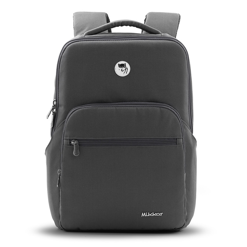 Mặt trước balo đính logo chú sói biểu tượng thương hiệu và logo hợp kim MIKKOR nổi bật.